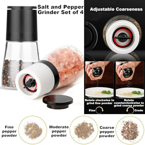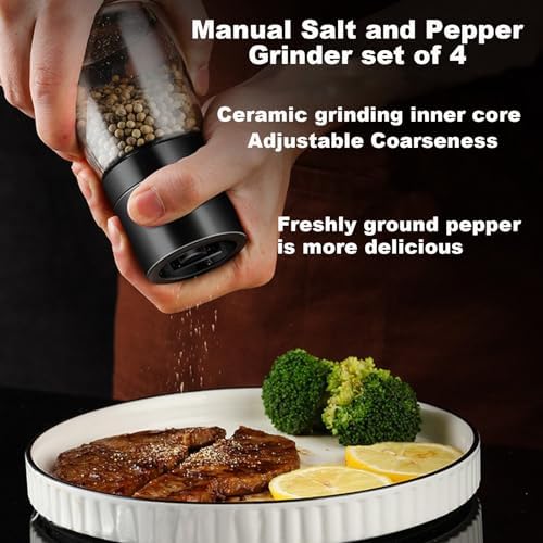 Premium Salt and Pepper Grinder Set of 4,Salt Grinder Refillable,Manual Salt and Pepper Mill Grinder Set,Adjustable Ceramic Salt Mill,Black Pepper Grinder Refillable,Glass Salt and Pepper Shaker