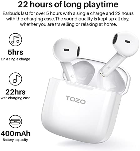 [Long Lasting Battery ] TOZO A3 earbuds lasts 5 hours for normal use (50% volume) on a single charge,quick charging technology enables 1.5 hours of listening from just 10 minutes of charge,headphones + charging compartment can last up to 22 hours.the powerful battery allow for all day listening. which gives you excellent experience of long endurance.