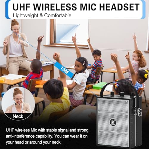 RELIABLE WIRELESS PA SYSTEM — With a wireless range of up to 15 meters, you can move freely and engage your audience with confidence. Say goodbye to mic drop-outs and hello to a seamless, professional performance. the headset microphone is lightweight and comfortable. It is not only a head-worn microphone but also can be used as a neck-worn microphone. You just wear it directly around your neck and adjust the distance between the microphone and your mouth.