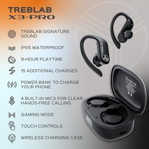 TREBLAB X3 Pro True Wireless Earbuds – Wireless Bluetooth 5.3 145H Playtime Sports Earbuds with Earhook, Earphones for Phone