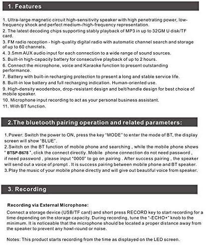 User ManualI. Features 1. Strong performing magnetic circuit, high-sensitivity speaker with low-frequency shock and perfect high-frequency representation. 2. Includes the latest decoding chips supporting stable playback of MP3 up to 32GB U disk/TF card. 3. FM radio reception – high-quality digital radio with automatic channel search and storage of up to 60 channels. 4. 3. 5mm AUX audio input for each connection to a wide range of sound sources 3. 5mm AUX audio input for each connection to a wide range of sound sources. 5. Built-in high-capacity battery for consecutive playback of up to 6 hours. 6. Includes 2 x MIC inputs, adjustable reverb, voice and Karaoke function for outstanding audio and plug-and-play performance. 7. Battery with built-in recharging protection for a long performance life. 8. Low battery and full charge indicator. 9. Includes belt/handle design for portable and on the go commutes. 10. Connect via audio output or Bluetooth to external sound sources. 11. Recording features included. II. Recording Recording via External Microphone: Connect a storage device (USB/TF card) and short press RECORD key to start recording for desired time depending on the storage capacity. During recording, tune the “-ECHO+” knob to minimum. Microphone should be pointed away from the speaker to prevent feedback. Note: This product starts recording from the time as displayed on the LED screen. III. Bluetooth pairing operation and related parameters: 1.Power: switch the power to ON. Press ‘MODE’ until the display screen will show “BLUE”. 2.Switch on the Bluetooth function of your device and pair. Device will show as ‘BTSP-B678’. Pair devices. If you need to enter a passcode simply use “0000” pair devices. After pairing successfully the speaker will confirm with voice command. 3.Select the media/music you want to play to experience your new product! In The Box: 1X Bluetooth Speaker 1X Strap 1X Adapter 1X User Manual
