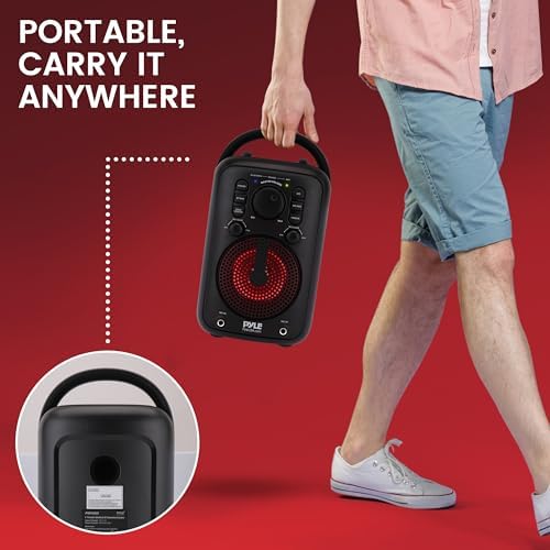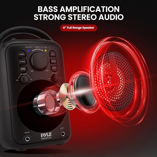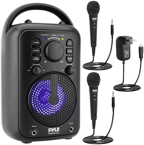 Features: – True Wireless Stereo System – With Two Wired Microphone – Powerful Speaker With Room-Filling Sound and Big Bass – Portable Speaker System – High-Powered Loudspeaker Style – Bluetooth Wireless Music Streaming Ability – Connect & Stream Audio from External Devices – Aux (3.5mm) Input Connector Jack – Two 6.5mm Microphone input – Two Microphone Volume Control – Microphone Echo Button – Microphone Voice Change – Microphone Music Vocal Removing – For Indoor / Outdoor Use Bluetooth Wireless Streaming: – Built-in Bluetooth for Wireless Music Streaming – Simple & Hassle-Free Pairing – Works with All of Today’s Latest Devices – Smartphones, Tablets, Laptops, Computers, etc. – Bluetooth Version: 5.0 – Bluetooth Network Name: ‘PYLEUSA’ – Wireless Range: Up to 32’ ft. What’s in the Box: – Speaker System – Power Adapter – (2) Wired Microphone Technical Specs: – Construction Material: ABS – Max Power Output: 180 Watts Max – Sound System: 4’’ -inch Full Range Speaker – Power Supply: AC110~240V, Auto Switchable, 15V/1.5A Power Adapter – Product Dimensions (L x W x H): 6.7” x 7.2” x 11.8” (Inch)