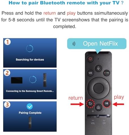 [Simple Pairing Process]: Effortlessly pair your remote by pressing and holding the Back/Exit and Play/Pause buttons simultaneously for 5-10 seconds. Once paired, you’ll see the message “Pairing complete”on your TV screen. If pairing fails, simply repeat this step.