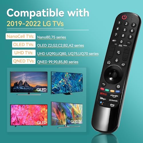 Name: Voice&Pointer Function Remote Control Color: Black Compatible With: OLED Z2, G2, C2, B2, A2 ZX, WX, GX, CX, BX series QNED99, 90, 85, 80 series NANO80, NANO99, NANO97, NANO 91, NANO90, NANO85, NANO81 series UQ90, UQ80, UQ75, UQ80 UN85, UN73 series ect. Suitable for:2021 2022 2023 LG Voice Remotes Models: MR21GA, MR21GC, MR22GA, MR22GC, MR23GA, MR23GN and also compatible for 2017-2023 models MR18BA, MR19BA, MR20GA.