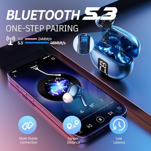 Fast & Stable Connection: Our Bluetooth earbuds offer a fast and stable connection with Bluetooth version 5.3, providing you with a seamless listening experience. Pairing the earbuds with your device is effortless, and once they are successfully paired, they will automatically reconnect to the last connected device when you open the charging case. With a range of 10m/33ft, allowing enjoy uninterrupted music while staying connected to your device. Widely compatible for iPhone, Android, laptop.