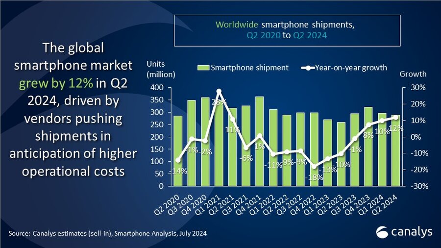 The latest Canalys research reveals that the worldwide smartphone market continued to grow strongly in Q2 2024, with shipments reaching